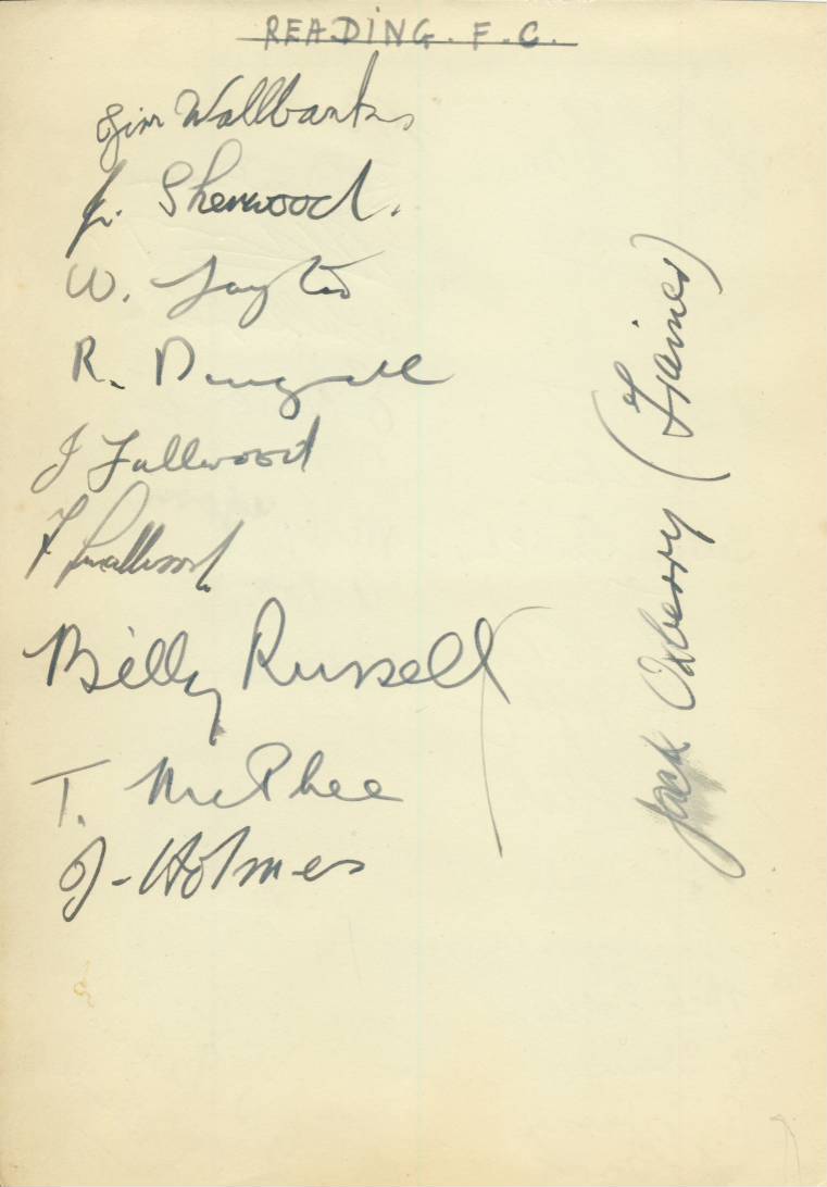 Album page. Signed in ink by 24 Crystal Palace players from the late 1930s, including FW Dawes, AG Dawes, Owens (twice), Chesters, Walker, Smith, Wilson, F Gregory, Steele, Daniels, Lievesley, Collins, Shanks, Bark (twice), Blackman, Gillespie, M Gregory, Robson, Hudgell and Irwin (trainer). On the reverse 9 Reading players and the trainer have signed, including Wallbanks, Sherwood, Russell, McPhee, Holmes and Oxberry (trainer).