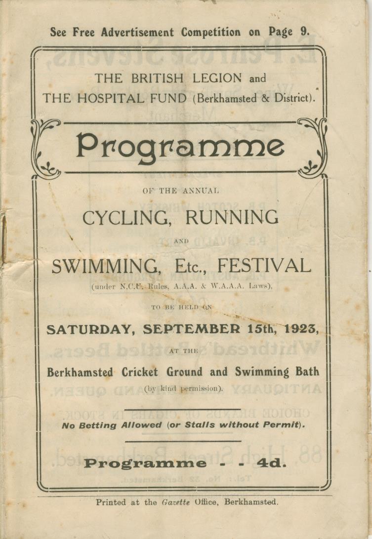 Programme for a festival ay Berkhamstead cricket Club in 1923 featuring cycling, running and swimming events.