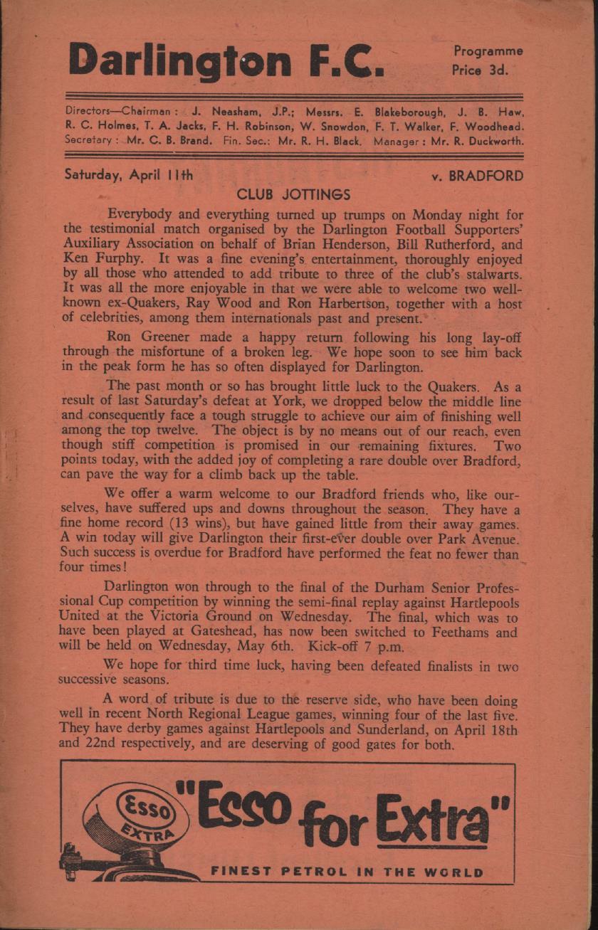 Football programme for the match between Darlington v Bradford Park Avenue on 11th April 1959.