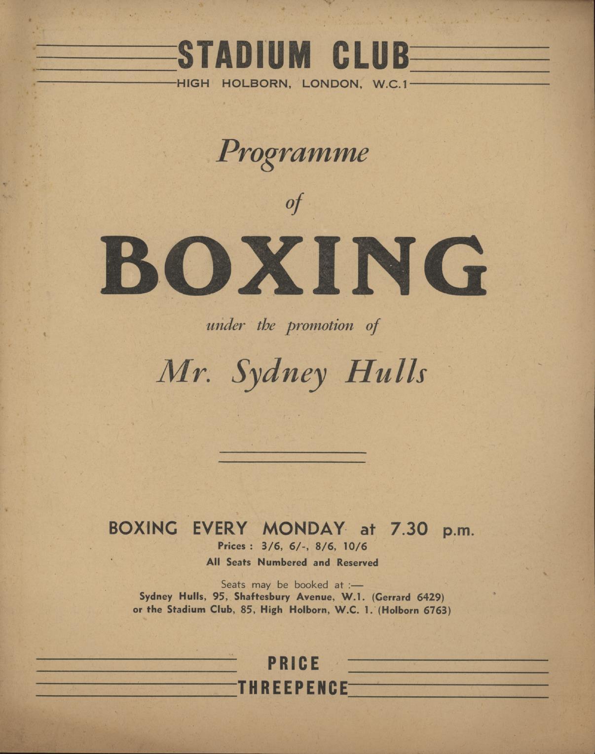 Official boxing programme for the contests on March 11th 1940, held at the Stadium Club, High Holborn. The card also included Bob Savage v Alf Boom and Charlie Roberts v Jackie Stayton.