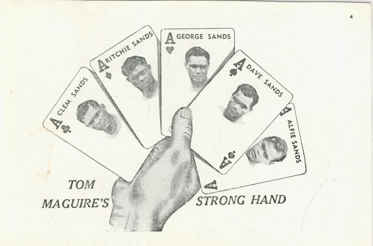 Postcard-sized card with images of the five Sands brothers of Australia as 'Tom Maguire's Strong Hand'. The reverse advertises Maguire as Australia's Premier Boxing Teacher.