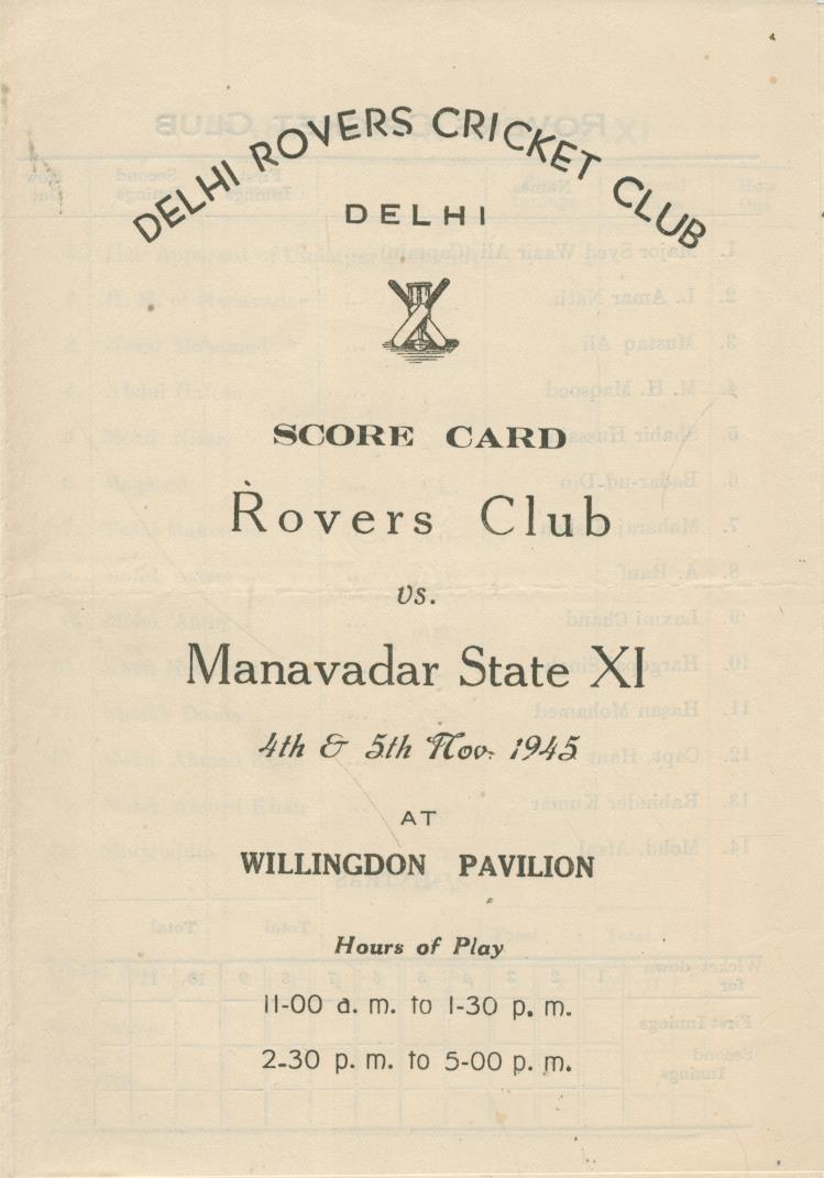 Cricket » Cricket Scorecards » Overseas » DELHI ROVERS CRICKET CLUB V MANAVADAR STATE XI 1945 CRICKET SCORECARD