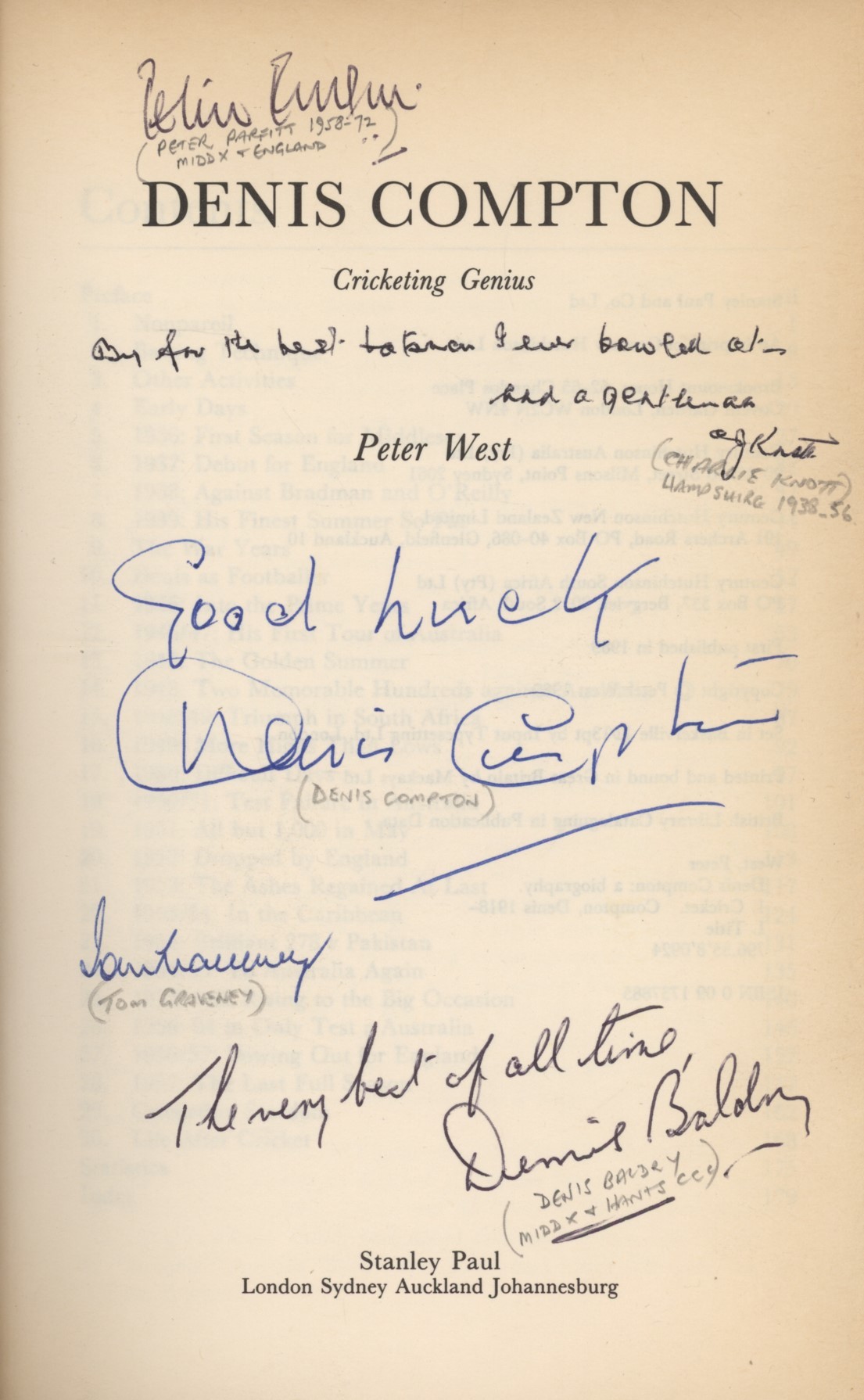 8vo. 184pp. 8 b/w plates. Dust-wrapper, very good. Signed to title-page by Compton and also by Peter Parfitt, Tom Graveney, Charlie Knott (who also writes "By far the best batsman that I ever bowled at - and a gentleman") and Dennis Baldry (who also writes "The very best of all time"). Further signed by his grandson Nick Compton and by Desmond Haynes to fly-leaf.