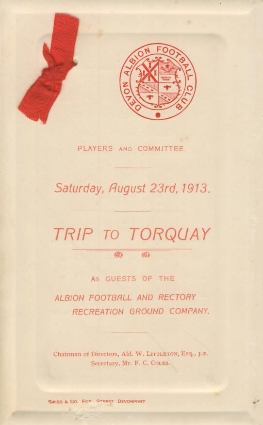 Itinerary and menu card for a trip to Torquay, organised by Devon Albion Rugby Football Club on August 23rd, 1913. The day trip started and finished at Millbay station, Plymouth. It seems that this team was actually Devonport Albion Rugby Football Club, which merged with Plymouth RFC in 1920 to form the current Plymouth Albion RFC.