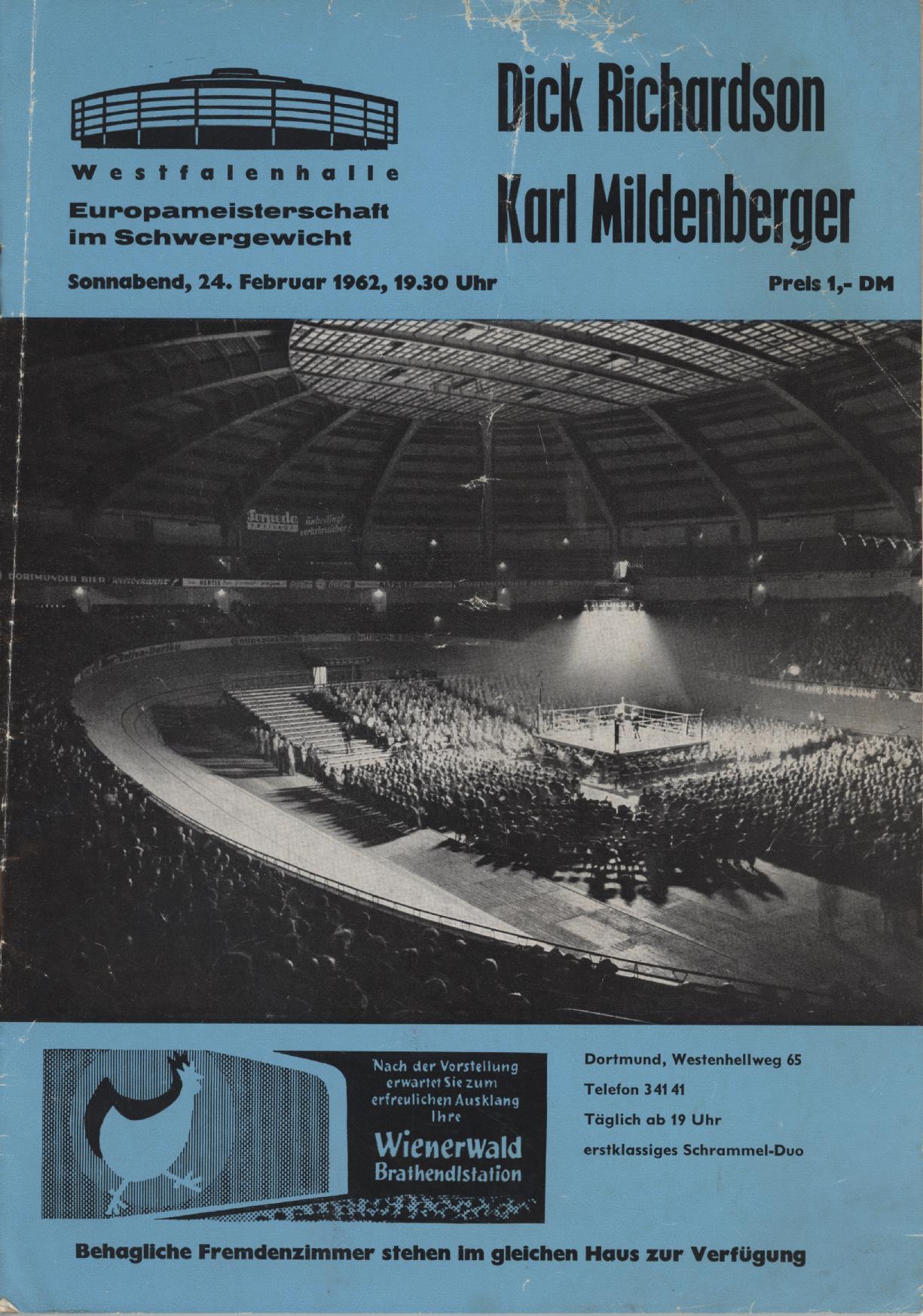 Official programme for the European Heavyweight Fight in Dortmund, Germany on 24th February 1962. Richardson won by knockout in the first round.