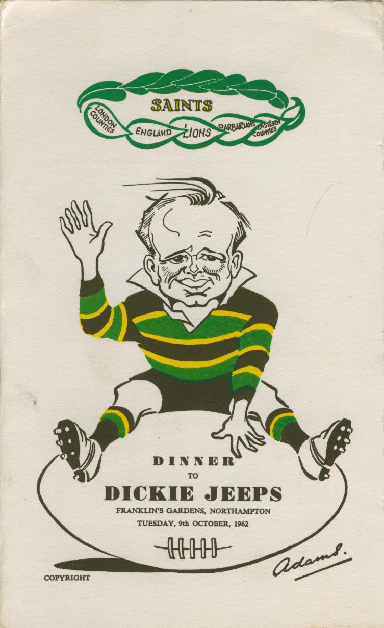 Menu card for the Dinner to Dickie Jeeps, the famous Northampton, England and British Lions scrum half, held at Franklin's Gardens, Northampton, 9th October 1962.