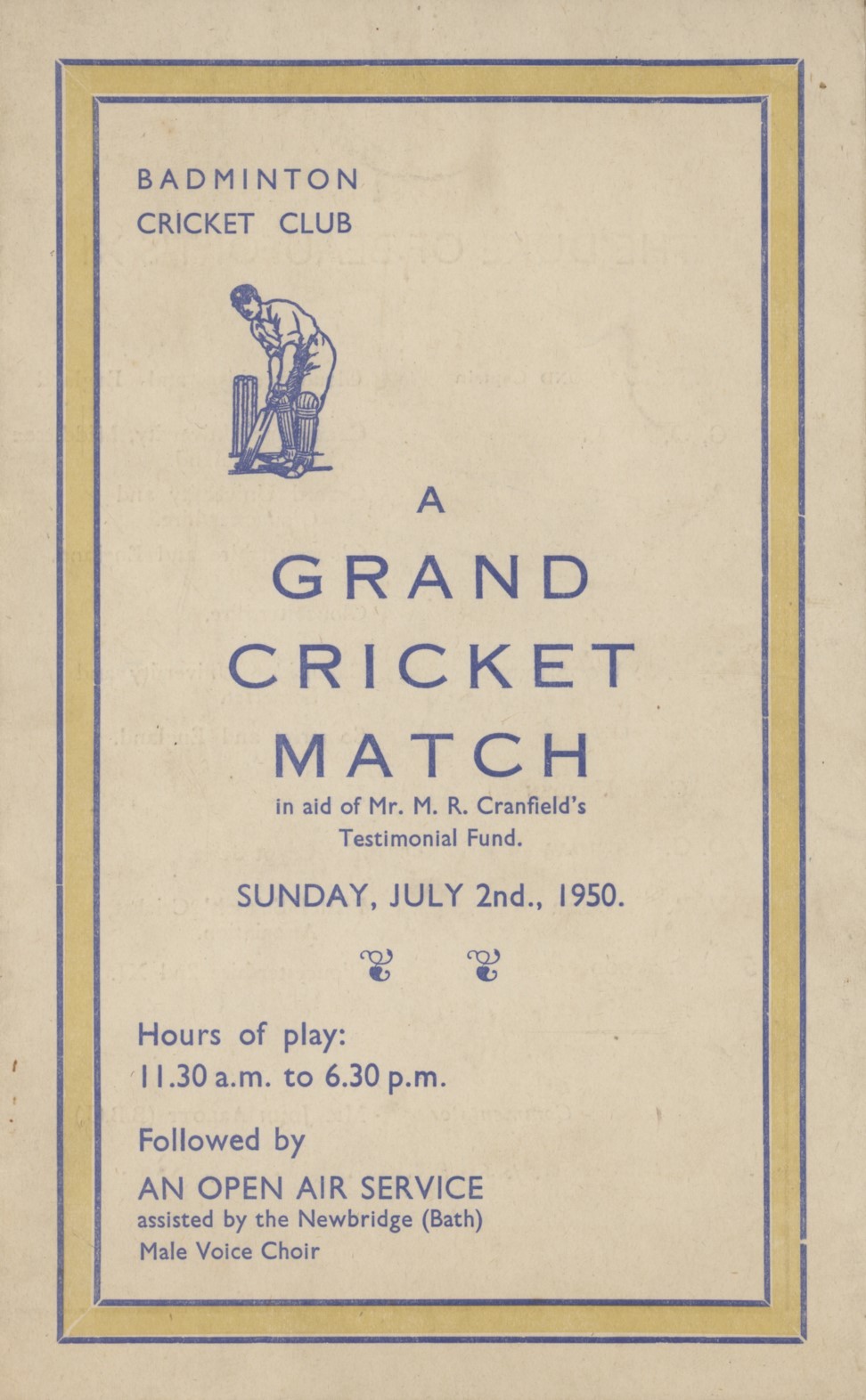 Souvenir programme for the match at Badminton CC in aid of M.R. Cranfield's Testimonial Fund on July 2nd 1950. The Duke's XI included Hammond, Gubby Allen, B.H. Lyon and R.A. Sinfield, the County XI included many Gloucestershire players including Graveney, Goddard and Cook. Commentry was given by John Arlott.