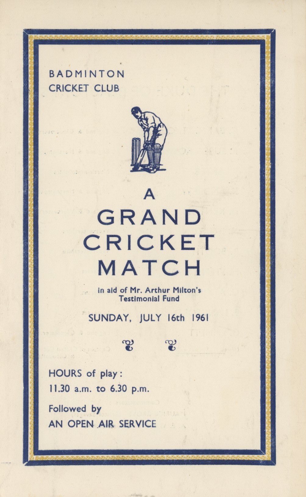Souvenir programme for the match at Badminton CC in aid of Arthur Milton's Testimonial Fund on July 16th 1961. The Duke's XI included Barnett, Subba Row, Kenyon, Andrew and Emmett; the County XI included many Gloucestershire players including Milton, Pugh, Mortimore, Cook, Allen and Smith.