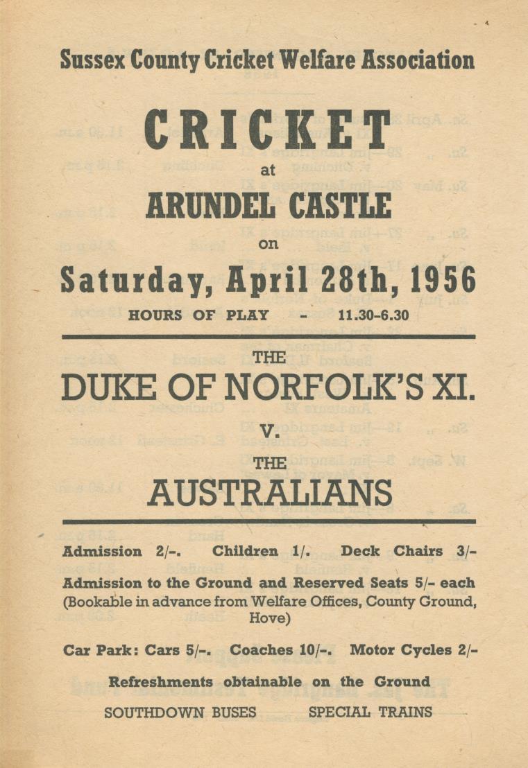 Cricket flyer advertising the match between the Duke of Norfolk's XI and The Australians, played at Arundel Castle on April 28th, 1956.