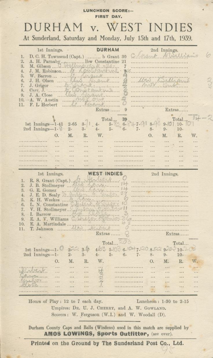 DURHAM V WEST INDIES 1939 CRICKET SCORECARD