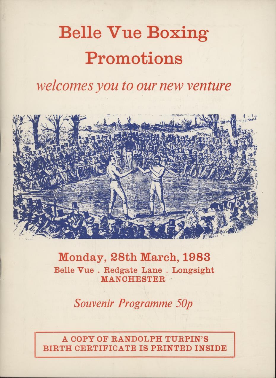 Official programme for the fight at Belle Vue, Manchester, on 28th March 1983. The card also included Jonjo Green v Ian Lazarus.