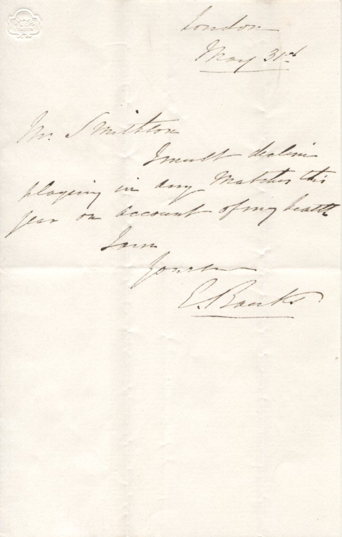 Handwritten letter in ink from Banks to Mr Smithson, the then Hon. Sec. of Kent CCC, declining his invitation to play due to ill health. Probably dates from 1848 or 1849. Accompanied by typewritten transcript. Banks played for Kent from 1842-46.