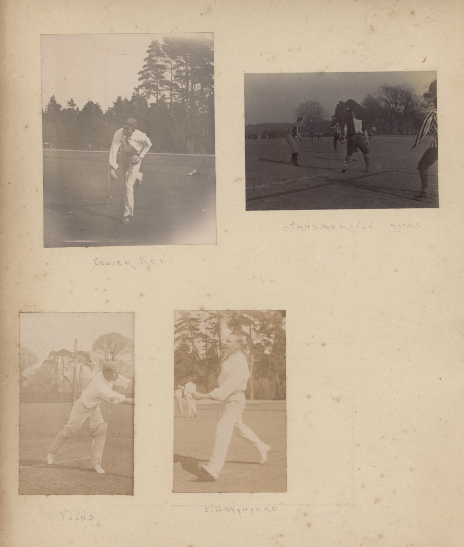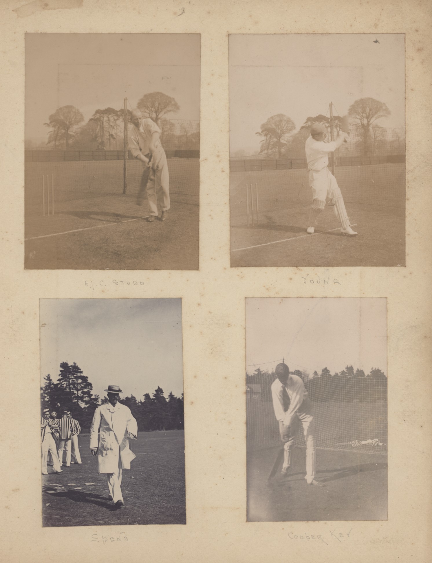 Album page, probably 1880s, mounted with eight original action photographs (7 cricket, 1 football). The players are shown practising in the nets and feature E.G. Wynyard, the famous Hampshire batsman (shown bowling), E.J.C. Studd (MCC), 2 photos of Young (probably H.I. Young of Essex and England), 2 photos of Charles Cooper-Key (Oxford University) and one of GJ Spens (Hampshire) while umpiring. Also a nice football action photograph, titled 'Stansborough kicking'. A unique glimpse of Victorians at sport.