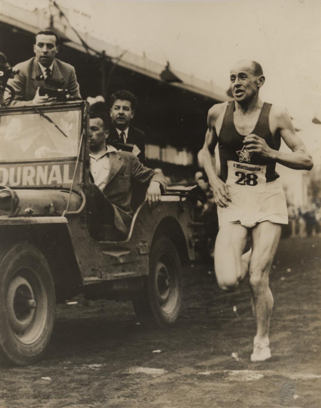 Original Press photograph of Zatopek winning a cross-country race in Vincennes, organised by the Communist newspaper "L'Humanite", dated Match 22nd, 1954.