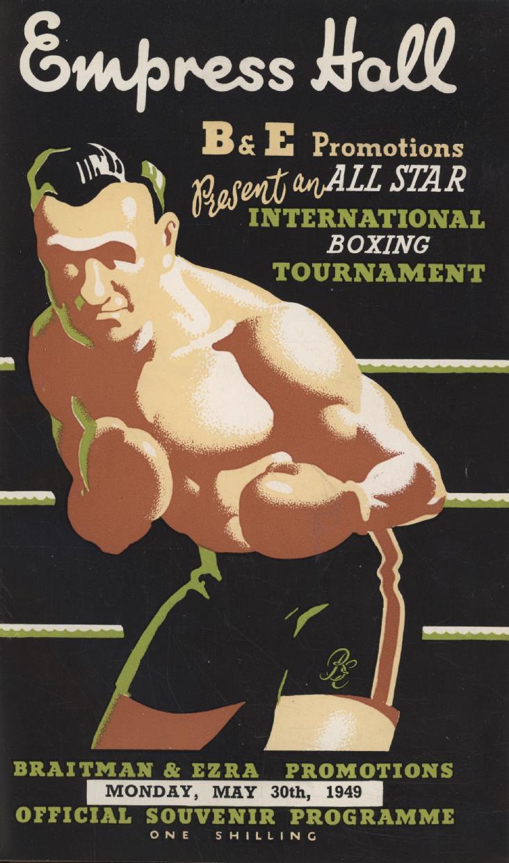 A fabulous complete set of boxing programmes from London's Empress Hall between 30 May 1949 and 23 May 1950, specially bound in a presentation volume dedicated on the cover to Reg Gutteridge, then of the Evening News, with fighters including Jack London, Alf Hines, Ronnie Clayton, Al Phillips and Dick Turpin.