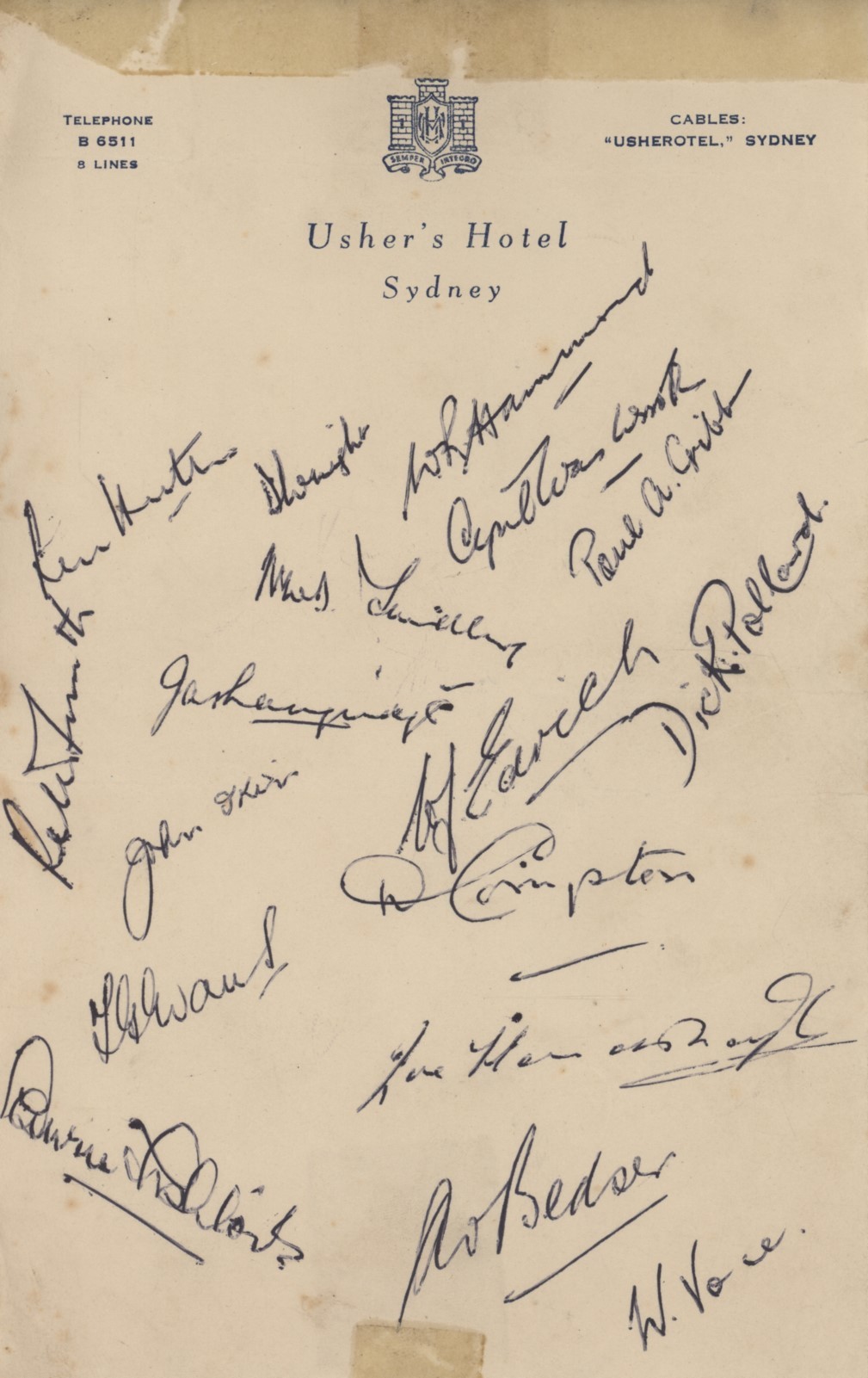 Sheet of headed notepaper (Usher's Hotel, Sydney). Signed in ink by all 17 members of the England tour party to Australia - WR Hammond, W Voce, TG Evans, PA Gibb, DCS Compton, R Pollard, NWD Yardley, WJ Edrich, Jas Langridge, JT Ikin, C Washbrook, LB Fishlock, DVP Wright, AV Bedser, LHutton, J Hardstaff and TPB Smith.