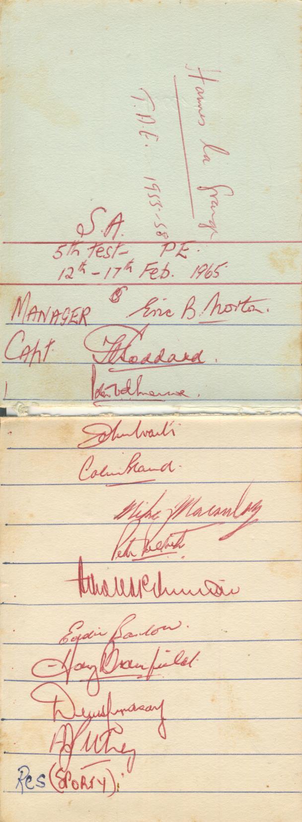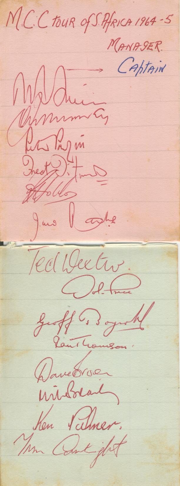 Three album pages, signed in red ink by 14 members of the England cricket team that toured South Africa in 1964-65 and by the South African team that played in the 5th Test at Port Elizabeth. English autographs include Smith, Boycott, Dexter, Brearley, Parfitt, Titmus and Murray (not signed by Barrington and Allen) and the South Africans (11 players plus the manager) included Goddard, Bland, Barlow and Peter Pollock. Not signed by Graeme Pollock.