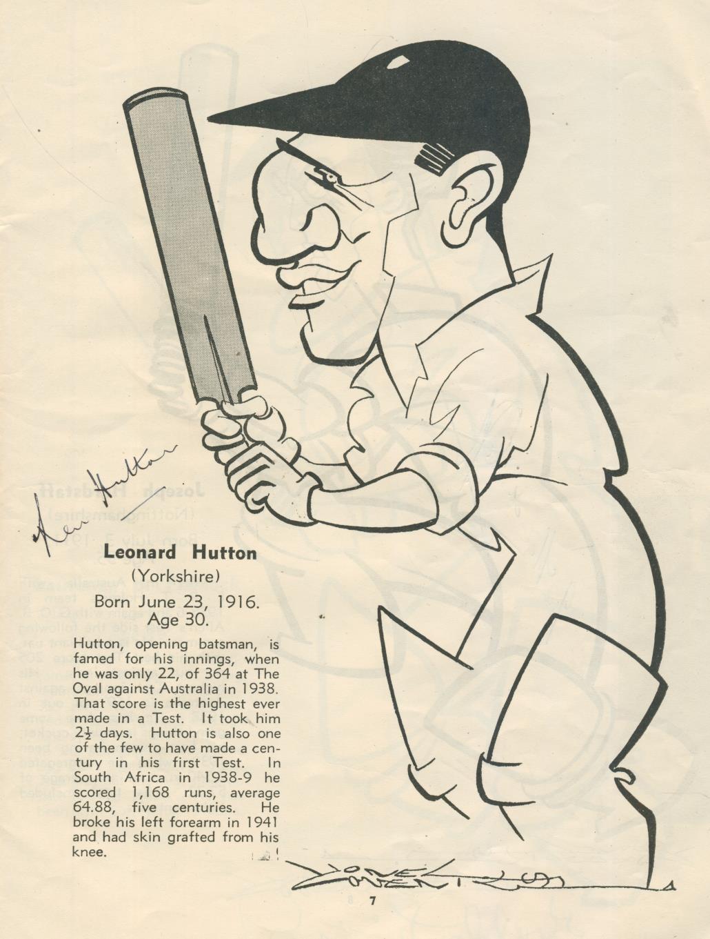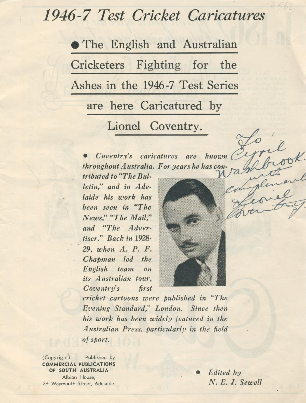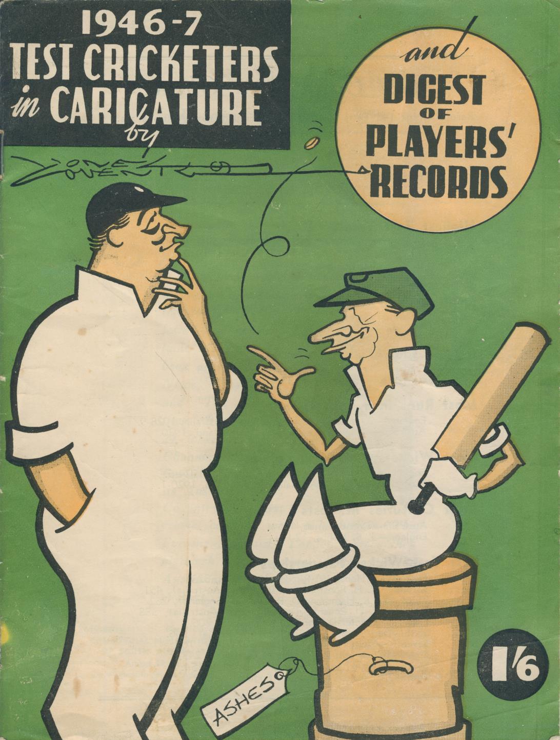 Paperback. Small 4to. 32pp. Contains 28 full-page caricatures of the England and Australia teams, each accompanied by a brief biography. Illustrated paper wrappers, sl rubbed, dot-to-dot puzzle on the back completed. Presentation copy from the illustrator Lionel Coventry to Cyril Washbrook with ink inscription to the titlepage. Also signed next to their caricatures by 13 members of the tour party - NWD Yardley, Len Hutton, Joe Hardstaff, LB Fishlock, TG Evans, DCS Compton, Alec Bedser, TPB Smith, Jim Langridge, Cyril Washbrook, Bill Edrich, DVP Wright, and Jack Ikin.