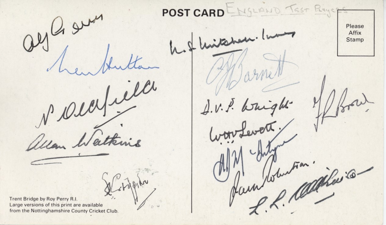 Colour postcard of Trent Bridge. Signed to reverse by 13 England cricketers, mostly pre-war - Gover, Hutton, Oldfield, Watkins, Griffith, Mitchell-Innes, Barnett, D.V.P. Wright, Levett, McIntyre, Robertson, Wilkinson and Brown.