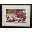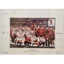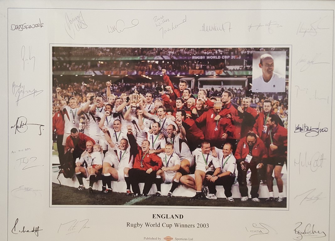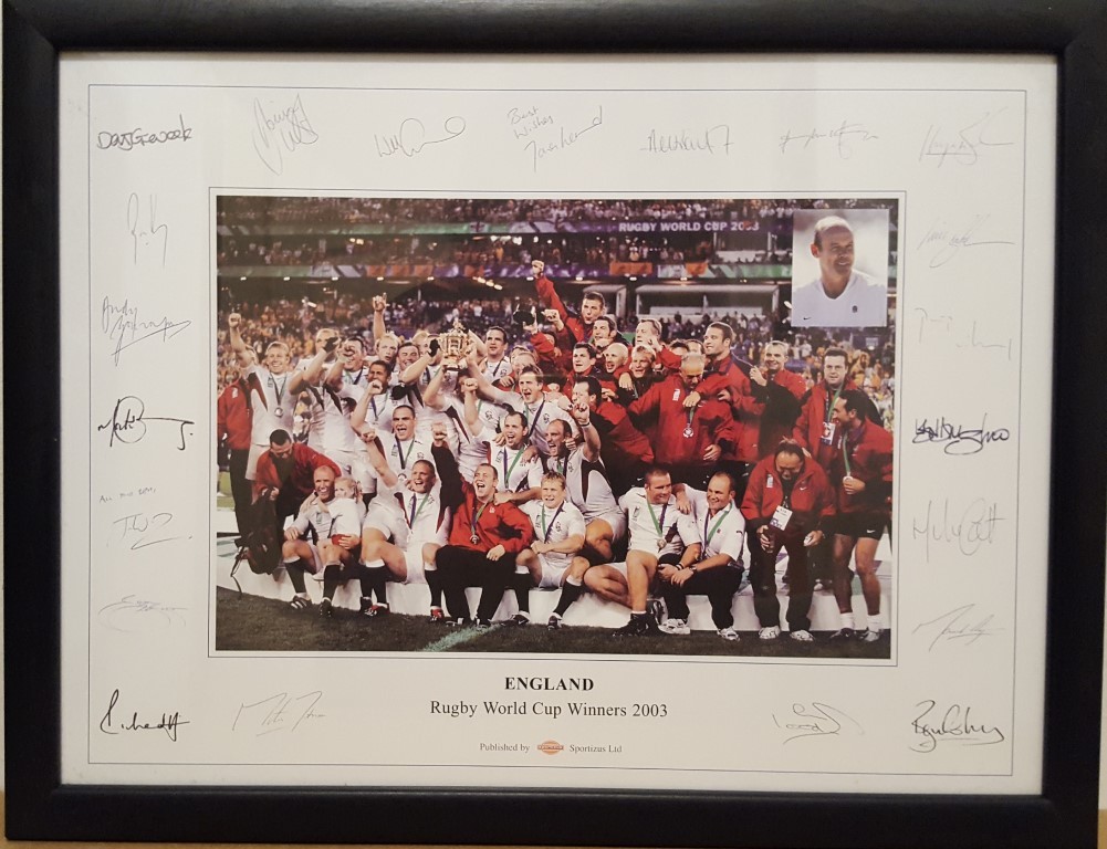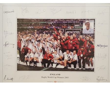 Colour photograph of the England rugby team after winning the 2003 World Cup. Signed around the border by 21 players and staff, including Johnson, Wilkinson, Catt, Cohen, Balshaw, Greenwood, Dawson, Hill etc.