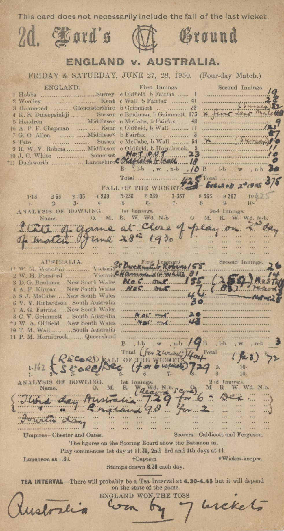 Cricket scorecard for the 1930 Ashes Test at Lords. There were big hundreds from Duleepsinhji and Woodfull but Bradman's 254 was, yet again, the outstanding contribution. Australia won by 7 wickets.