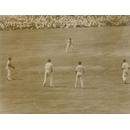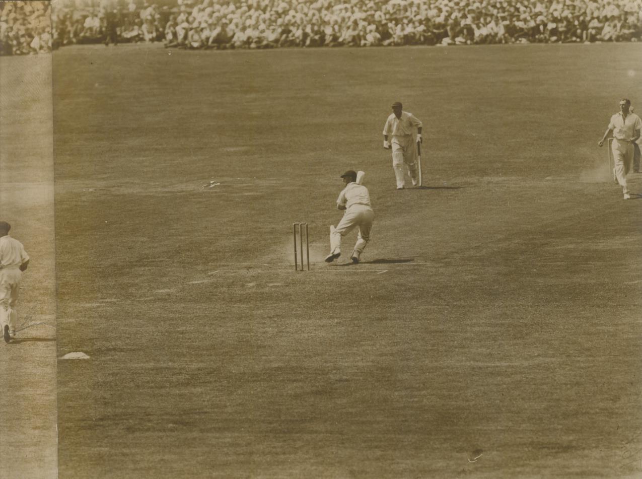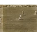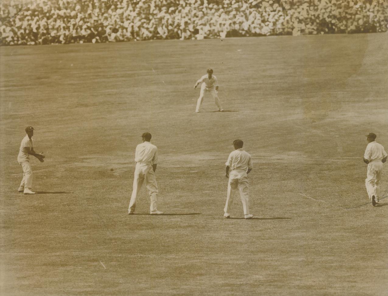 Original Press photograph (actually two taped together) from the 1934 Old Trafford Test match against Australia - showing Maurice Leyland cutting Wall through the slips during his innings of 153. Les Ames looks on, as do Oldfield, Darling, O'Reilly and McCabe.