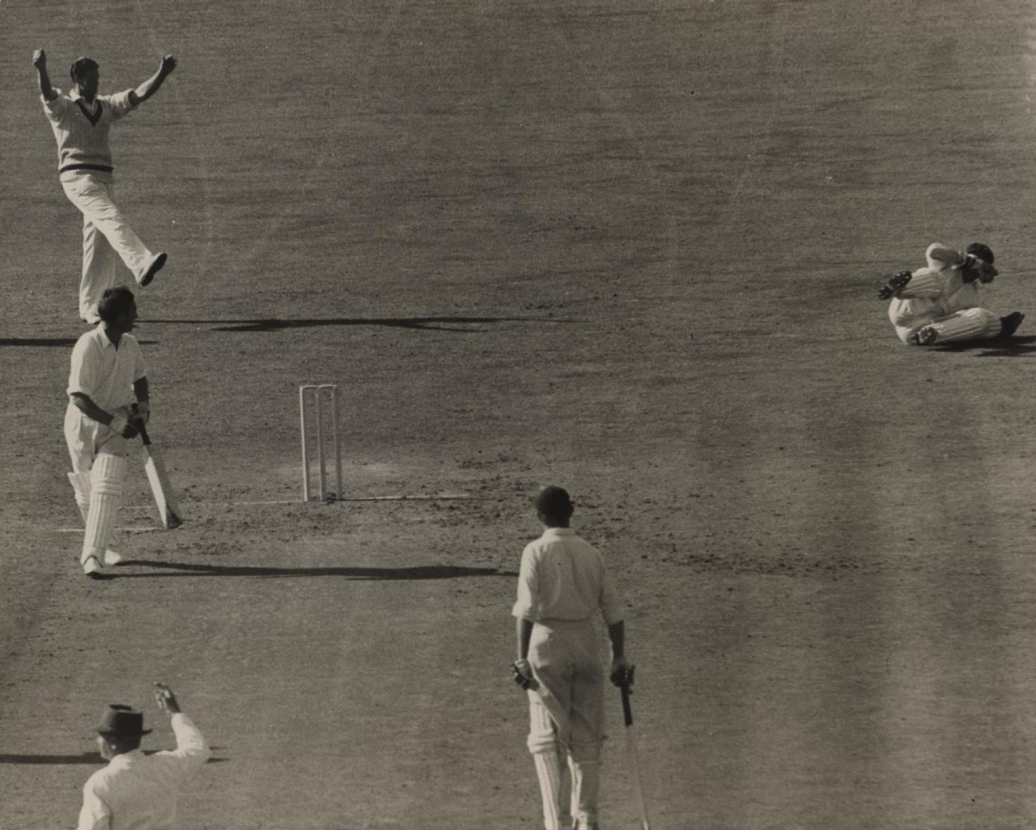 Original Press photograph of Compton being caught by Gil Langley behind the stumps off Lindwall during the fifth (and decisive) Test match of the 1953 Ashes series.