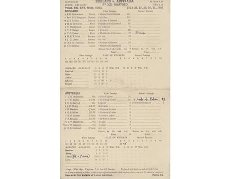25.5 x 15.5cm. Fully printed to end of both first innings and Harvey's wicket (end of day 3). Burke's wicket (which happened late on day 3) added in ink, along with a few further ink scores. The rest of the match is not completed. Central horizontal fold. Very good condition.