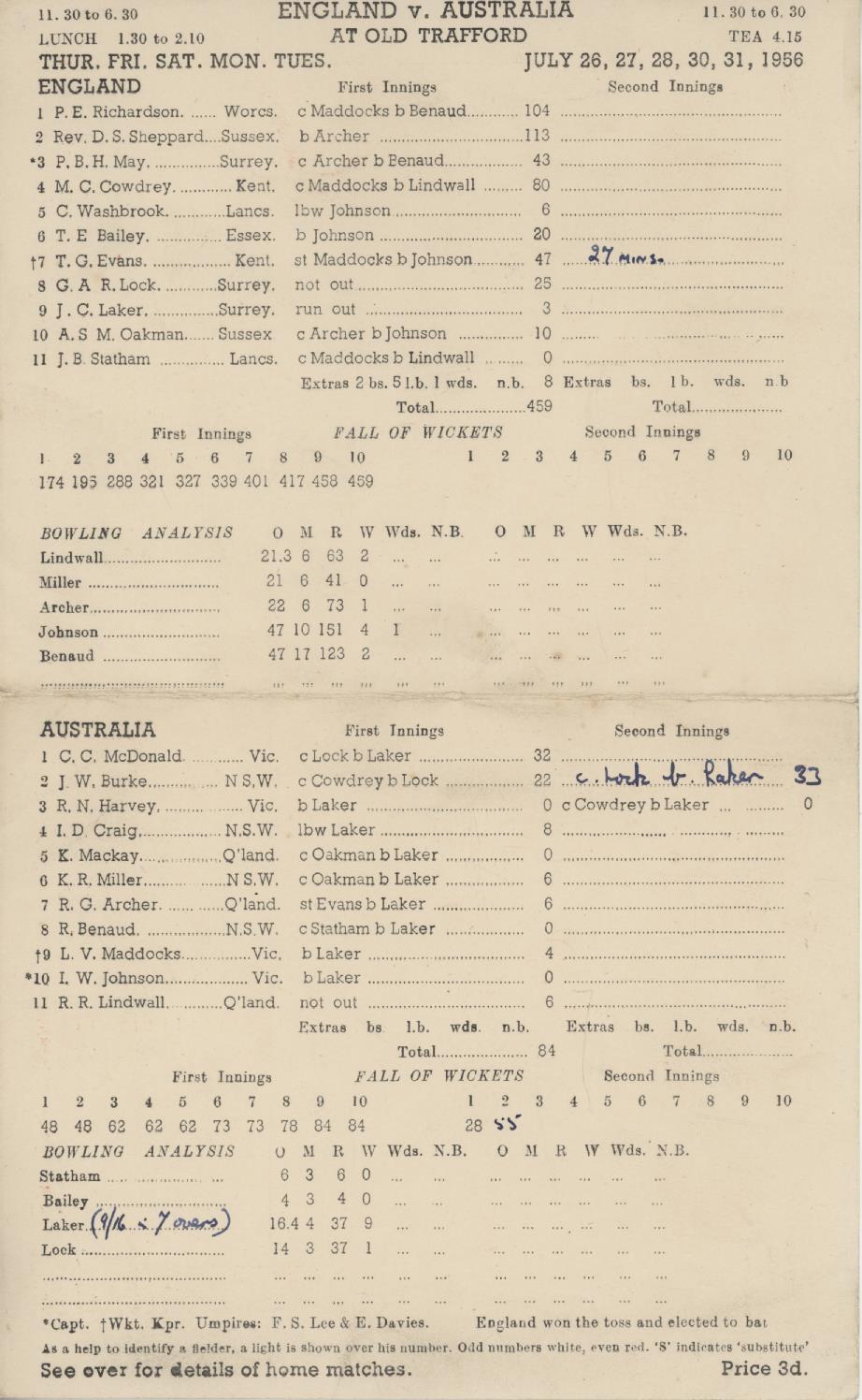 Cricket » Cricket Scorecards » Ashes » ENGLAND V AUSTRALIA 1956 (LAKER'S MATCH - 19 FOR 90) CRICKET SCORECARD