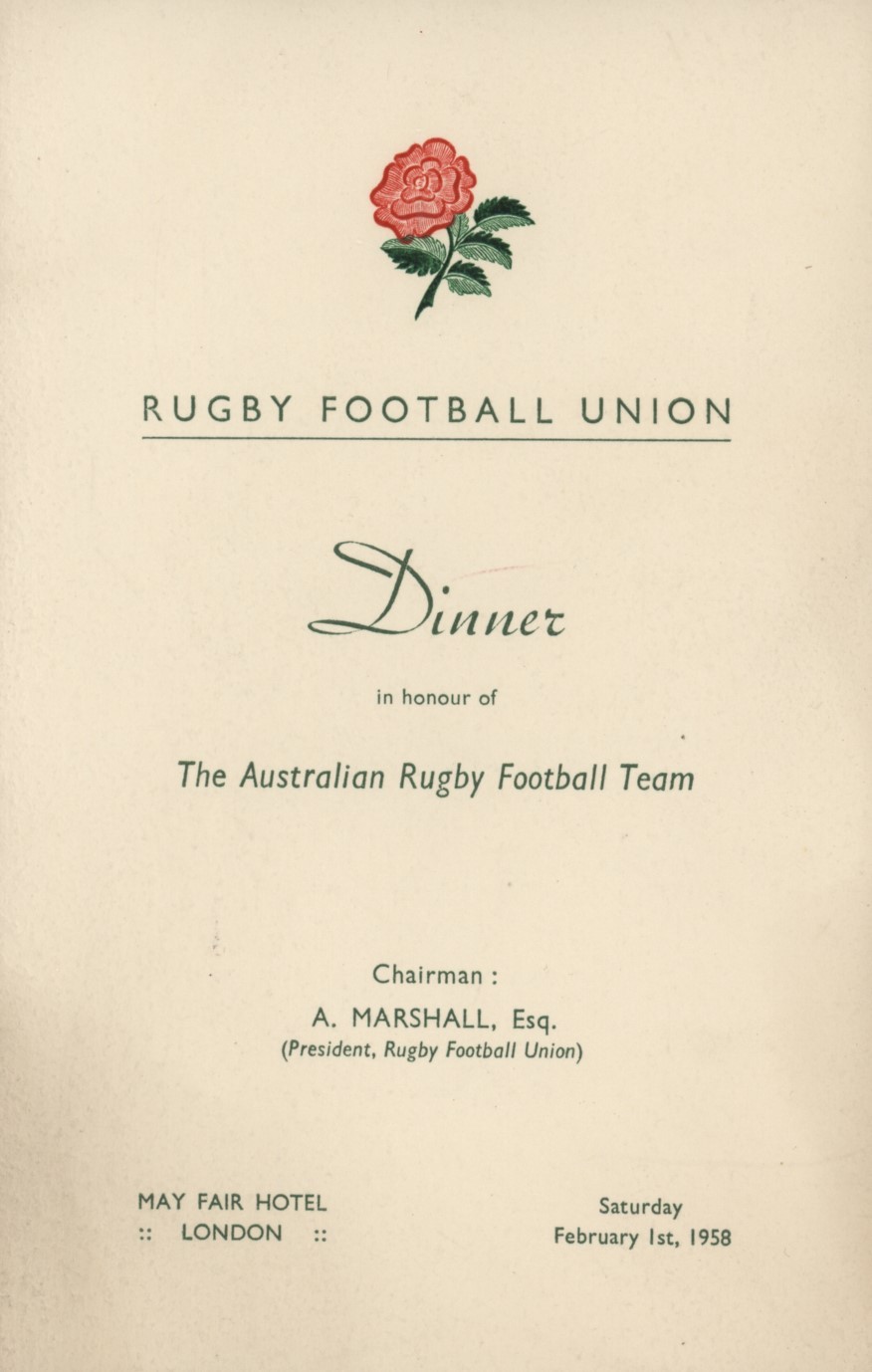 Menu card for a dinner in honour of The Australian Rugby Football Team, following the England-Australia international, at the May Fair Hotel, London W1, on 1 Feb 1958. England won 9-6.