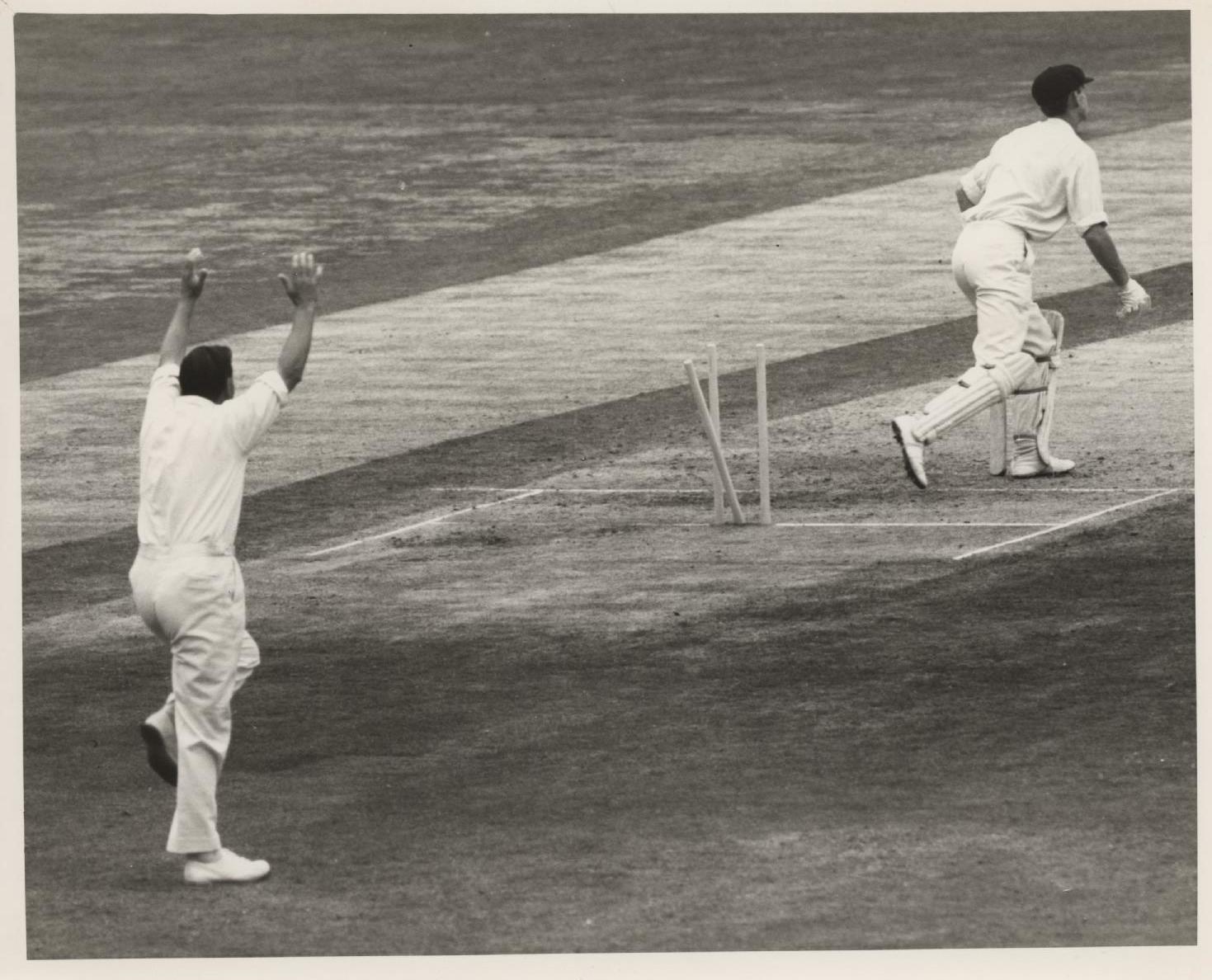 Original Press photograph showing Ian Redpath being bowled by Trueman at the Oval, dated August 15th, 1964. This was Trueman's 298th Test wicket and when he took the wicket of Graham McKenzie with his next ball it looked like he might achieve the 300 mark with a hatrick. It wasn't to be, but it didn't take much longer for him to reach the mark, when Cowdrey caught Neil Hawke in the slips.