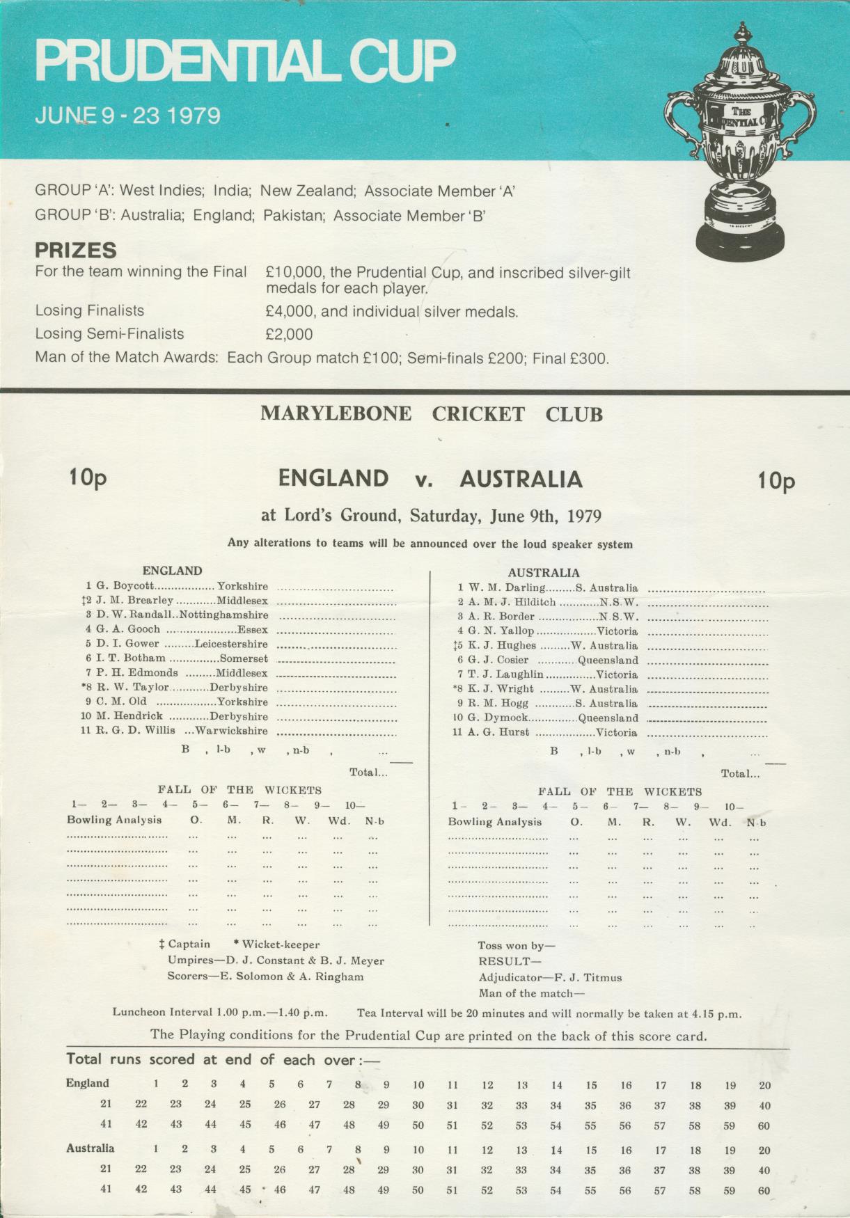 ENGLAND V AUSTRALIA 1979 (WORLD CUP MATCH) CRICKET SCORECARD