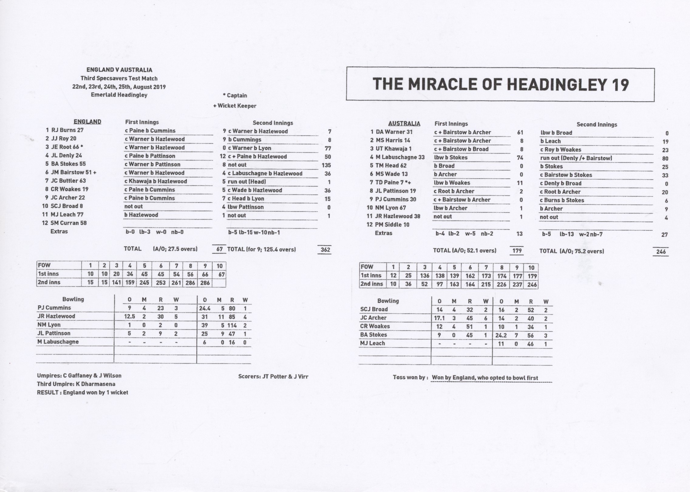 Fully printed scorecard for the "Miracle of Headingley" when Ben Stokes, ably supported by Jack Leach, pulled off a remarkable victory for England.
