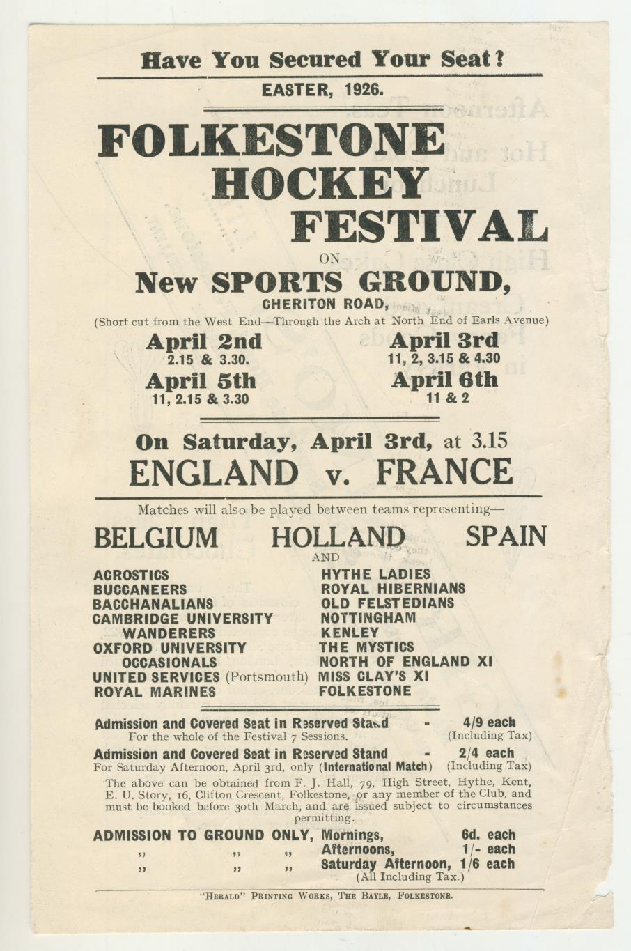 Original flyer advertising a hockey match between England and France on April 3rd 1926, as part of the Folkestone Hockey Festival. Teams from Belgium, Holland and Spain were also taking part in the festival.