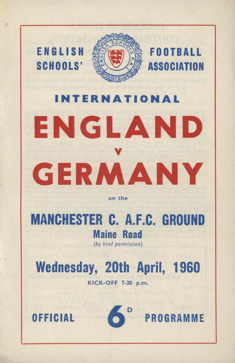 Official programme for the Schools' International between England v West Germany at Maine Road on 20th April 1960. David Pleat and Barry Fry represented England.