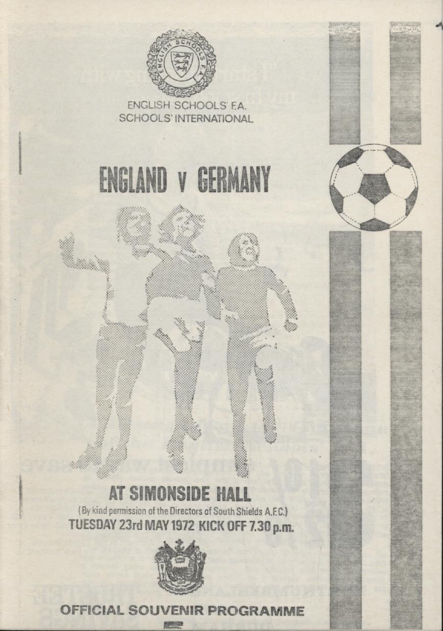 Official programme for the Schools' International between England v West Germany at Simonside Hall (South Shields) on 23rd May 1972. Ray Wilkins was representing England.