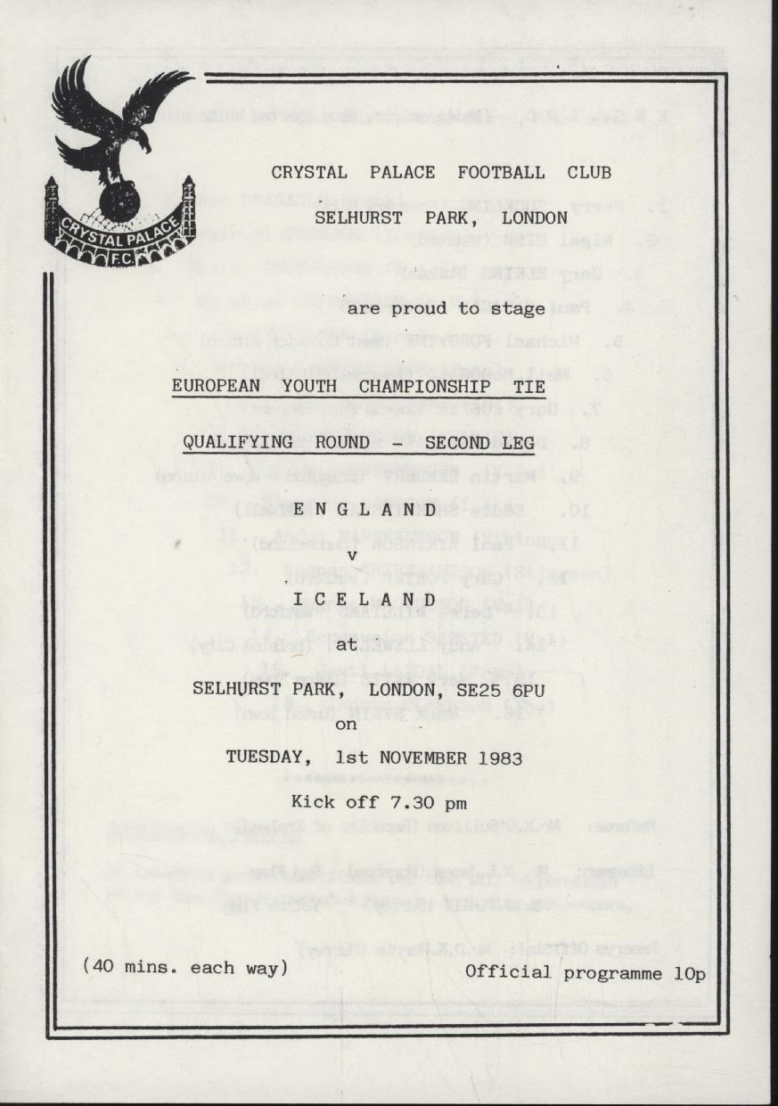ENGLAND V ICELAND (YOUTH) 1983-84 FOOTBALL PROGRAMME