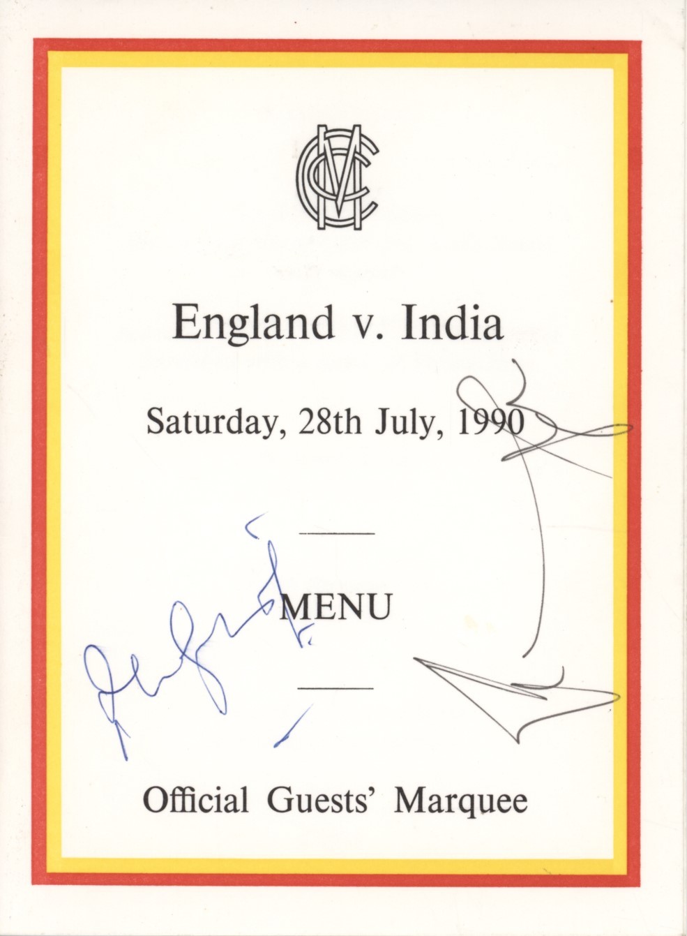 Menu card for a lunch held during the Lord's Test match of 1990, dated July 28th. Signed to the front by Kapil Dev, who famously smashed 4 sixes to save the follow on, and Ravi Shastri. Kapil was not out overnight on 14 when this was signed.