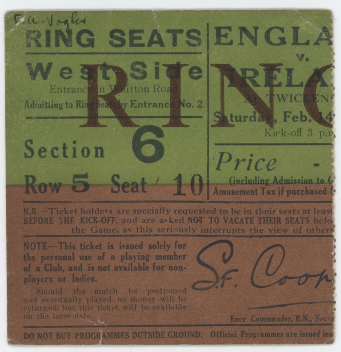 Original ticket for the match played at Twickenham on February 14th, 1931. Ireland won 6-5.