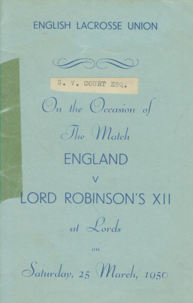 Menu card for a dinner held at Lord's Cricket Ground on the occasion of the lacrosse match between England and Lord Robinson's XII on March 25th 1950. The menu belonged to S.V. Court, one of the proposers of a toast and previously the captain of Kent County lacrosse team. Signed inside by H.J. Forrest, A. Wesley, Lord Robinson and one other (unidentified). Forrest and Wesley seemed to be important figures in lacrosse at the time (both were founders of the Centurion Lacrosse Club and Lord Robinson (Roy Robinson) was a first-class cricketer and accomplished university lacrosse player.