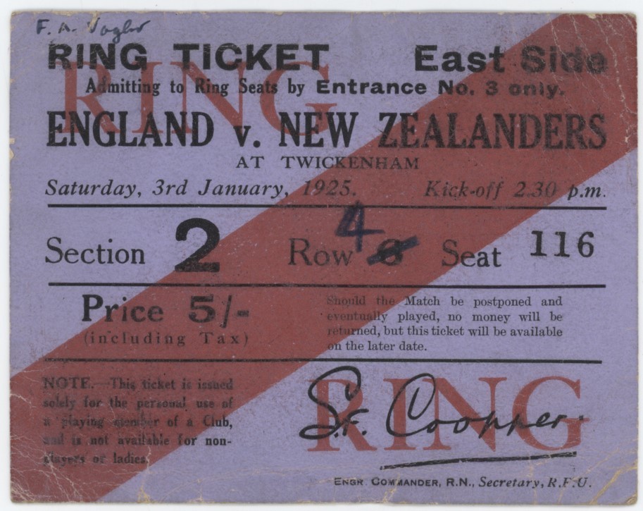 Original ticket for the match played at Twickenham on January 3rd, 1925. New Zealand won the match 17-11.