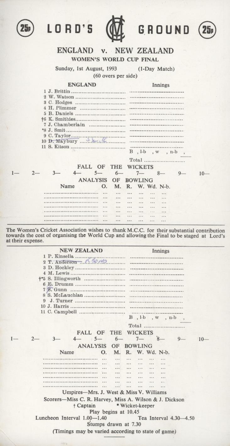 ENGLAND V NEW ZEALAND 1993 (WOMEN'S WORLD CUP FINAL) CRICKET SCORECARD