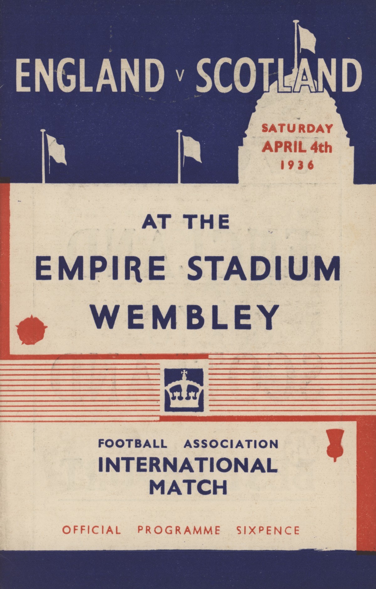 Official programme for the England v Scotland international played at Wembley, April 4th 1936. The match was drawn 1-1.