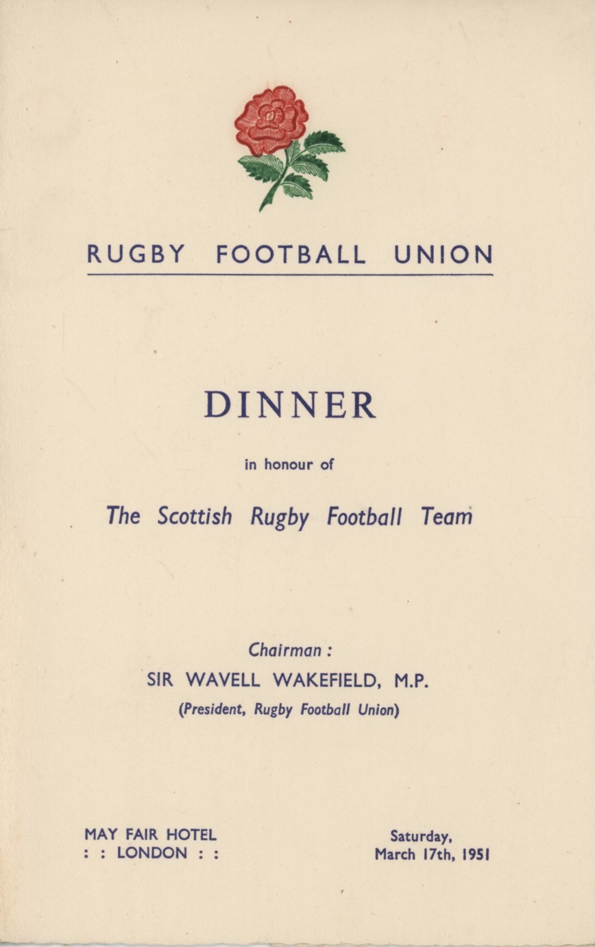 Menu card for a dinner in honour of The Scottish Rugby Football Team, following the England-Scotland international, at the May Fair Hotel, London W1, on 17 Mar 1951. England won 5-3.