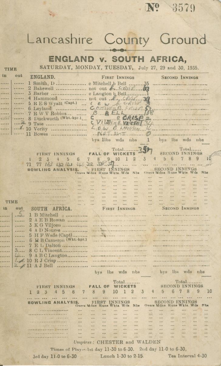 ENGLAND V SOUTH AFRICA 1935 (OLD TRAFFORD) CRICKET SCORECARD