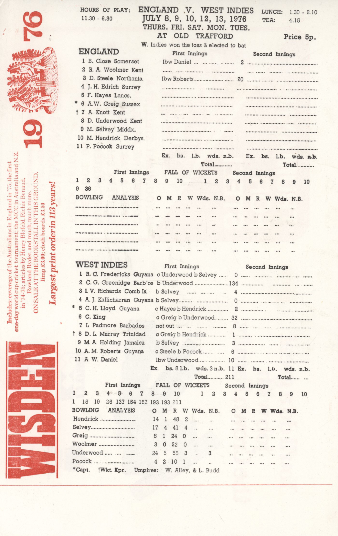 ENGLAND V WEST INDIES 1976 (OLD TRAFFORD) CRICKET SCORECARD