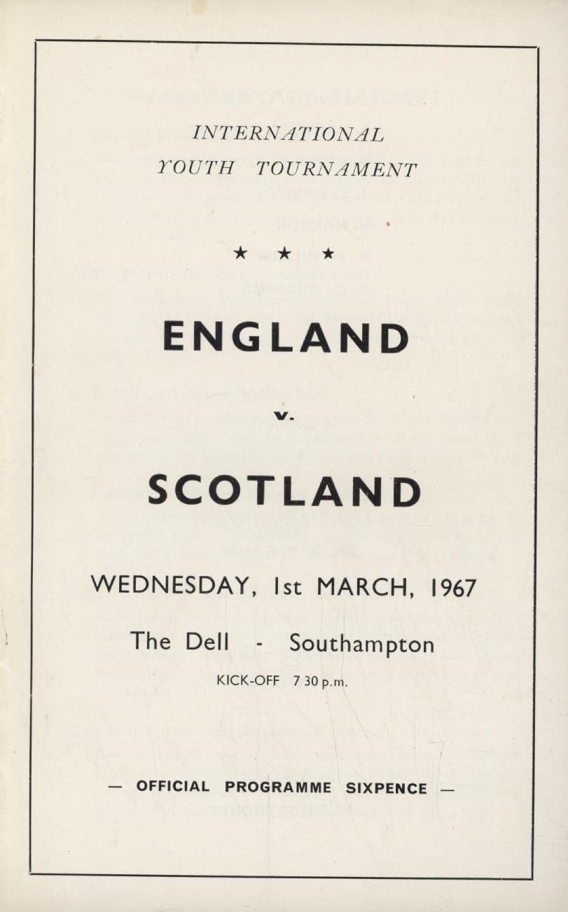 Official programme for the Youth International match played at the Dell, Southampton on 1st March 1967. The England team included Shilton, Mills, Brooking, Royle and Kidd.
