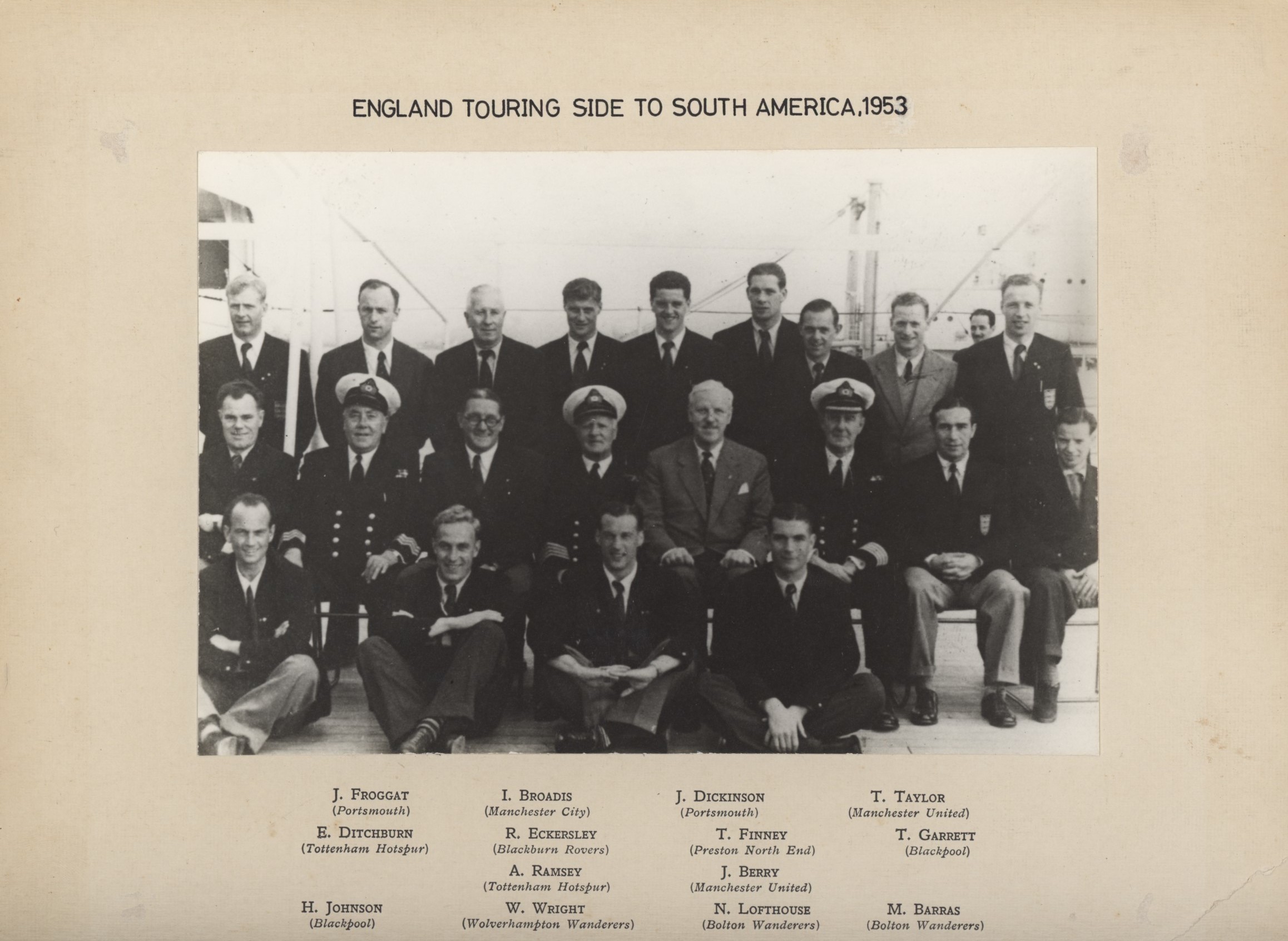 Official photograph of the England football team that toured South America and USA in May 1953. The team was Froggat, Broadis, Dickinson, Taylor, Ditchburn, Eckersley, Finney, Garrett, Ramsey, Berry, Johnson, Wright, Lofthouse and Barras. Full team legend printed beneath.