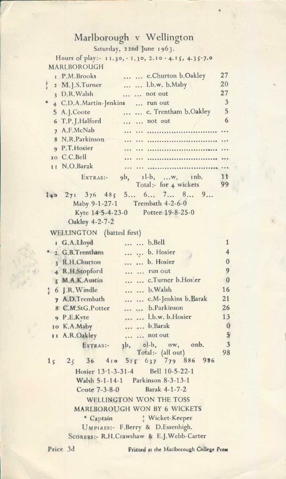 Played on June 22nd 1963. Marlborough won by 6 wickets. Christopher Martin-Jenkins played for Marlborough.