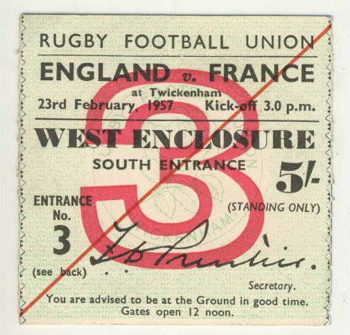 ENGLAND V FRANCE 1957 RUGBY TICKET